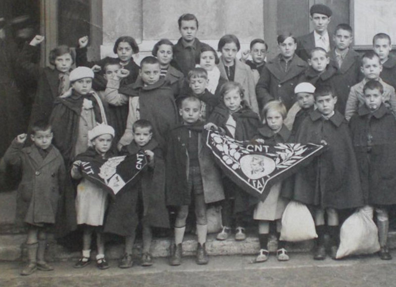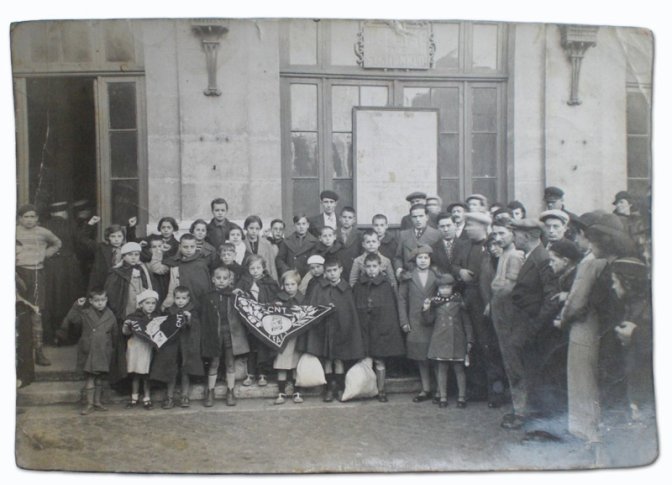 Photo de réfugiés anarchistes espagnols devant la gare de Valence (Drôme) vers 1937-38-39. A noter les enfants brandissant des foulards de la CNT FAI et de la CNT AIT et certains le poing en l’air.