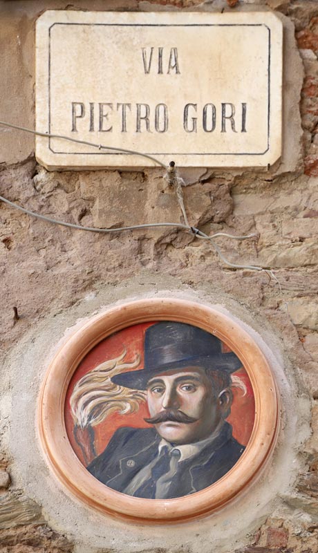 Plaque de la Via Pietro Gori à Campiglia Marittima (Province de Livourne, Toscane, Italie) et médaillon peint avec le portrait de Pietro Gori.