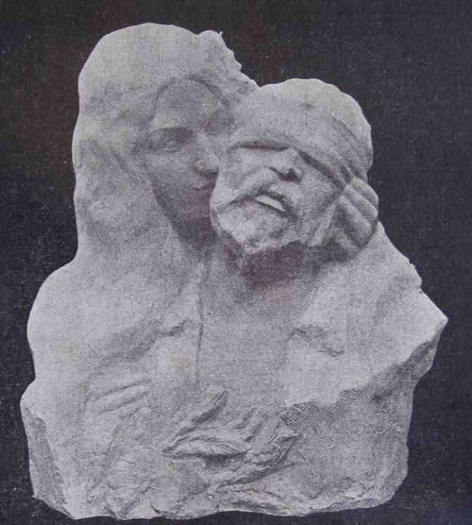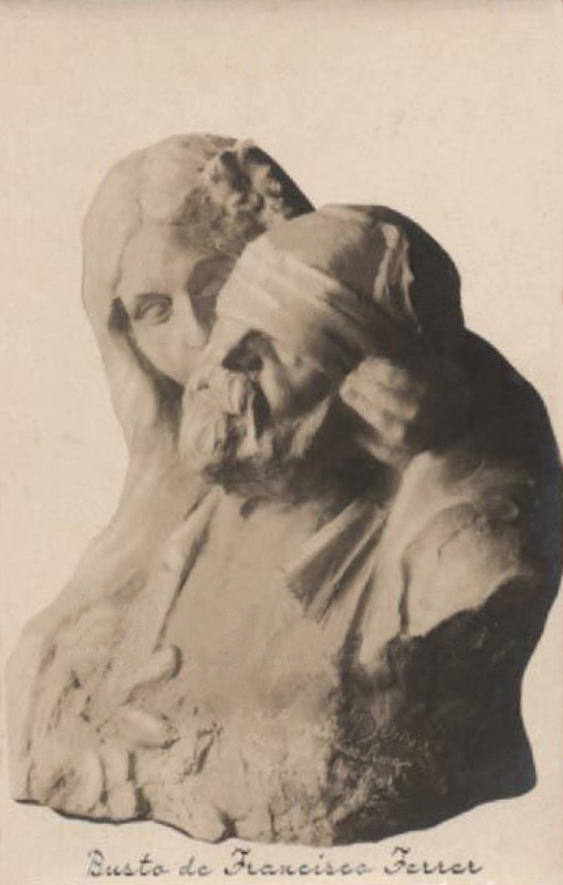 Buste de Francisco Ferrer par Emile Derré. Représente Ferrer les yeux bandés au moment de son exécution soutenu par sa fille préférée Trinidad. Cette sculpture était destinée à être placée à Lisbonne. Est-ce que ce souhait a été réalisé, mystère ?