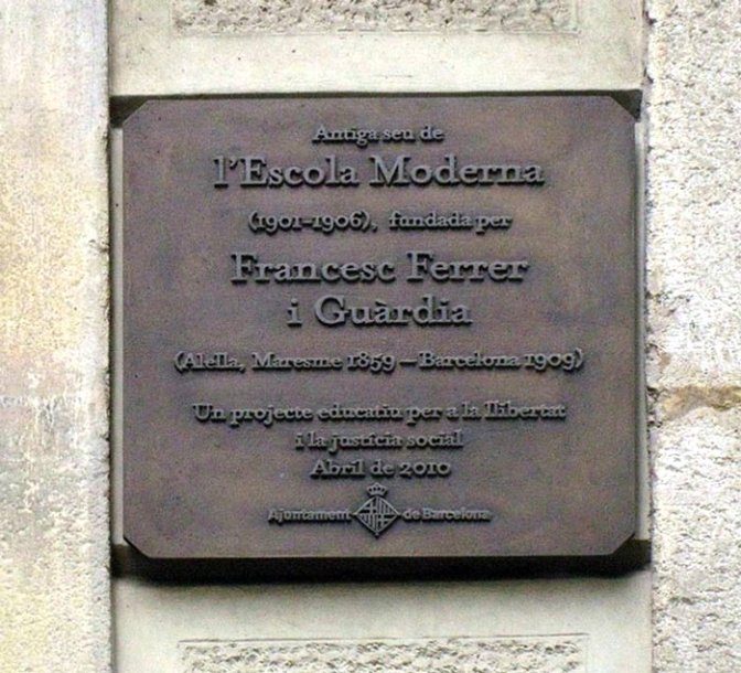 Plaque sur la maison, au numéro 56 de la rue (carrer) Bailèn à Barcelone. Ancien siège de l’École Moderne créée en 1901 par le pédagogue libertaire Francisco Ferrer.