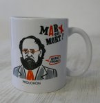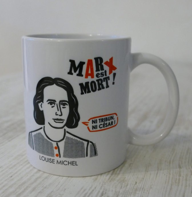 Mug de la boutique du Musée de l’Histoire Vivante de Montreuil : Marx est Mort (centenaire de sa mort en 1983) illustration de Solé, au verso Max est mort ! Louise Michel : Ni tribun, ni César ! Illustration de Fred Sochard.