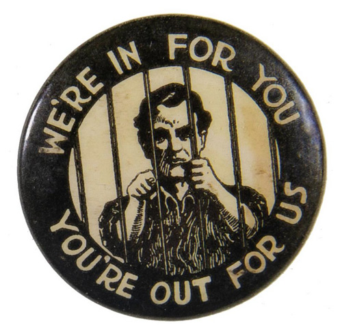 Badge de rappel du Comité de défense des militants des I.W.W. emprisonnés suite à la répression de 1921.