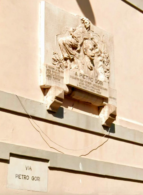 Plaque de marbre d’hommage à Pietro Gori à Piombino (Province de Livourne, Toscane, Italie). Cette plaque a été inaugurée en 1920, mais a été arrachée de son socle et jetée à la poubelle par les fascistes en 1926. Le 19 août 1945 "Piombino la rossa" a réparé le tort, et a replacé la plaque dans la rue qui porte son nom, "Via Pietro Gori" rendant ainsi "hommage à celui qui a consacré toute sa vie à la rédemption humaine".