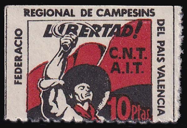 Viñeta : Libertad ! CNT AIT Federacio regional de campesins del Pais Valencia 10 ptas. / Vignette : Liberté ! CNT FAI Fédération régionale des paysans du Pays Valencien 10 ptas. 10 cts